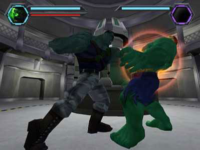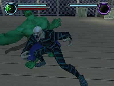 Below are some screen shots from the game, featuring already established Hulk villains Flux, Half Life and either Madman or Trauma. I'd bet it's Madman, the Leader's brother, but it could be Trauma. The graphics could be better. I'd be willing to met that the bearded foe from ShoWest is the Maestro. In the comics he was a pale, olive green color, which could look gray I guess. But it seems that the game is pretty much rooted in comic continuity and doesn't have much to do with the movie or it's villains.